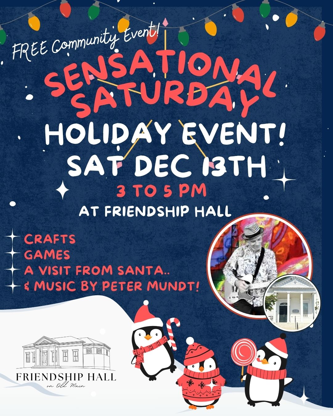 Friendship Hall 83 Old Main Street, Marshfield Hills, MA, United StatesEmbrace the holiday spirit with a special visit from Santa, cheerful music, and creative Christmas crafts. Bring the family for a heartwarming celebration—complete with jingle bells and plenty of holiday joy. Location & Contact: Friendship Hall, 83 Old Main Street, Marshfield Hills. For more info, email info@friendshiphall.org